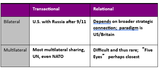 As someone who several times has managed U.S. intelligence agencies, including as Chair of the U.S. National Intelligence Council, I’ve long thought that the best way to persuade other countries to work with us was to help them see the issues in the same way we do. And that means sharing intelligence. It is useful to think of four forms of intelligence sharing, as in Table 1 below.