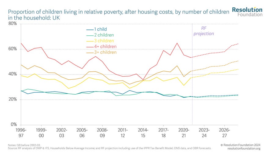 The two child limit, which means benefits are not paid for more than two children with only a few exceptions, is a policy laser targeted at increasing the numbers in poverty. It hits those already most at risk, of which almost half are single parent families. It now affects over 400k households containing around 1.5 million children. You can see from this Resolution Foundation chart the direct impact of the policy on poverty rates for bigger families.