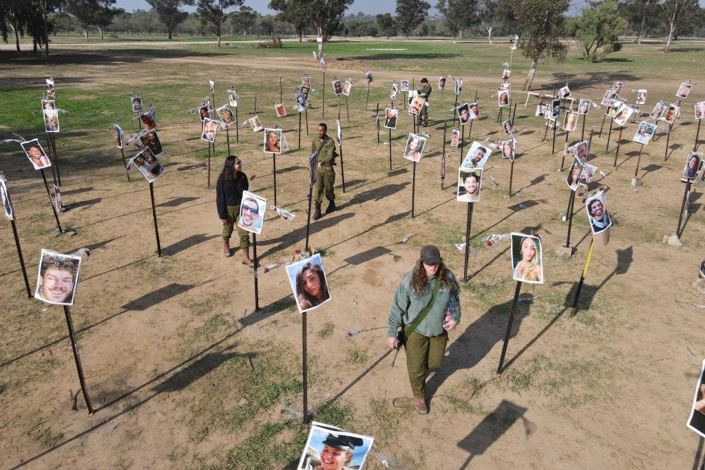 Israeli soliders at the site of the Supernova music festival walk between pictures of those killed or captured by Hamas on the 7th October