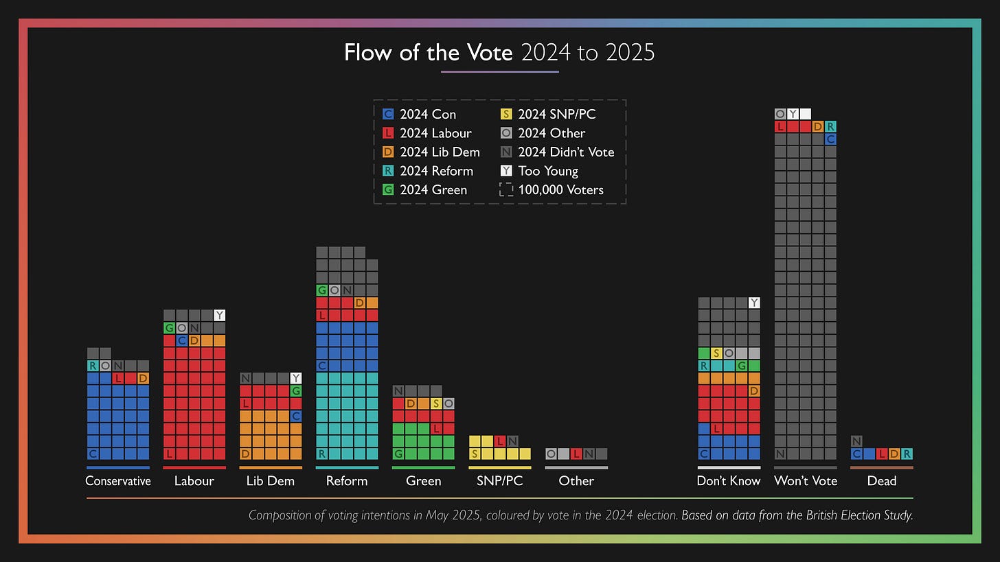 Using the BES data, we can show where 2024 voters have moved since the election.5 Each block represents 100,000 voters in the colour of their 2024 vote. There are undoubtedly some shifts people will find perplexing: for instance, roughly 100,000 voters have moved from the Greens to Reform. This is a useful reminder of the esoteric nature of political choices, but the key is to focus on the larger and more consequential movements, which we’ll look at in turn.